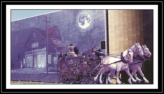 "Midnight Call" An old photograph provided the specifics for this scene of a horse-drawn fire rig leaving the Junction Station at 44th Ave SW and SW Alaska St. Also housed in the station was a police precinct and public restrooms. Motorized fire engines replaced Hose Company #32 in 1924 and provided fire protection until moving to 38th and Alaska in 1964. After remaining vacant for a few years, the station was razed in 1968 and remains a free parking lot for Junction shoppers. |